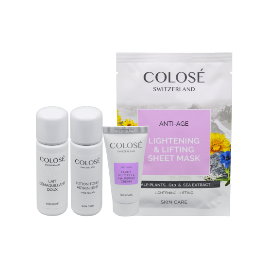Unser Pflanzenstammzellen-Kennenlernset bestehend aus Reinigungsmilch (40 ml), Gesichtswasser (40 ml), Pflanzenstammzellen-Creme (15 ml) und Anti Aging-Tuchmaske.